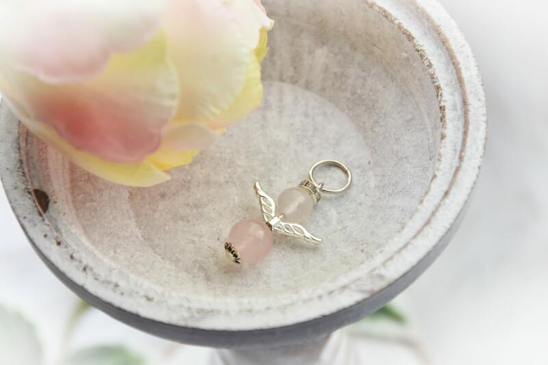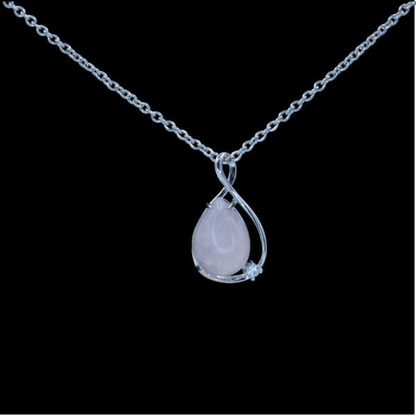 Csepp alakú rózsakvarc ásvány medál, "végtelen" jel foglalatban. Ásvány mérete: 14*18mm A rózsakvarc vélt gyógyhatása
