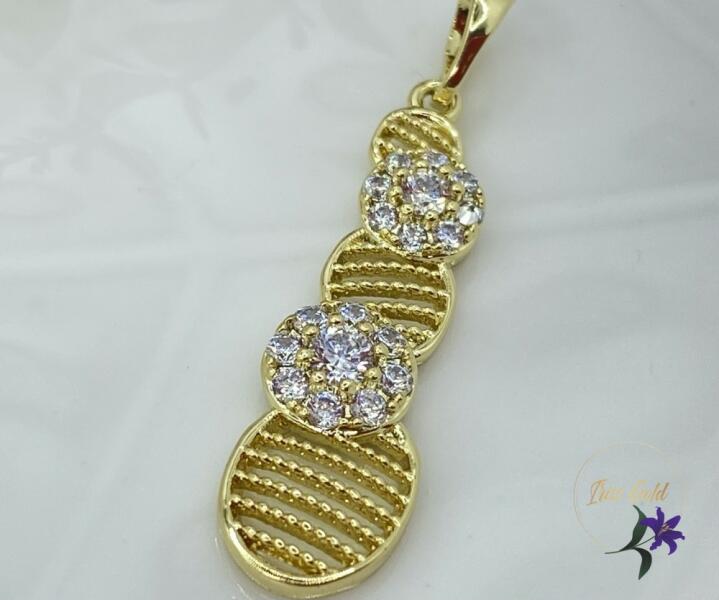 Nagyon szép 14 Kr színű medál cirkónia kövekkel Szin: 14Kr Méret: 35x7mm A forgalmazott divatékszerek alapanyaga nikkel és ólommentes ezért többnyire nem okoznak allergiás tüneteket, nyugodtan hordhatják fémérzékeny emberek is. Általában nem színezik a bőrt és más divatékszerekhez képest nagyságrendekkel jobb kopásállósággal rendelkeznek. A fehér (ezüst) színű é