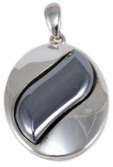 Különleges és igen mutatós, nagy méretű hematit kővel ékített fényes ovál ezüst medál.
