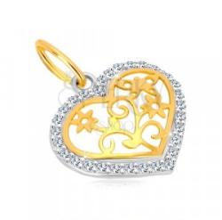 14K kombinált arany medál, szív alakzat. A szív körvonala fehér aranyból van, kerek, csiszolt, átlátszó cirkóniákkal körberakva. Középen virág és lepke alakzatú vágatok találhatóak sárga aranyból. A láncra kerüló szem vékony és ovális. Medál méretei: 13 x 11 mmA láncra kerülő szem szélessége: 1,5 mmMedál súlya: 0,5 gFémjelzéssel ellátott. Medál lánc nelk