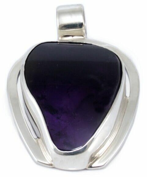 Különleges és egyedi formájú ametiszttel ékített ezüst foglalattal készült mutatós medál.