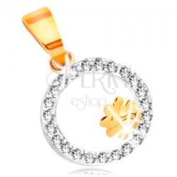 14K kombinált arany medál, csillogó karika, amelyet átlátszó cirkóniák díszítenek. Az alsó részén egy kis méretű négylevelű lóhere helyezkedik el. A láncra kerülő szem hosszúkás, felfelé szélesedik. Medál átmérője: 14 mmMedál súlya: 0,9 gLáncra kerülő szem szélessége: 3 mmFémjelzéssel ellátott. Medál lánc nélkül.
