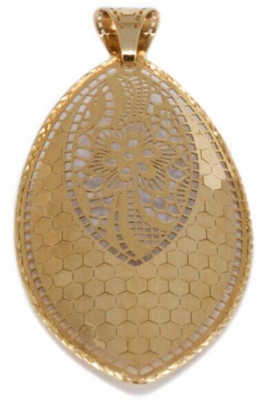 Különleges és igen muztatós, áttört virág mintával díszített, csillogó, domború kialakítású csónak alakú arany medál.