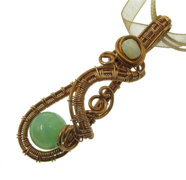 Természetes krizoprázból, és szívárvány színben irizáló etióp opál drágakőből készítettem réz drótékszeres ásvány medált. A krizopráz mérete: 10mm a fazettált opál mérete: 6*4mm Medál teljes magassága: 60mm Vörösréz huzalba foglaltam krizoprázt és gyönyörű, irizáló fényű természetes etióp opál drágakővel egészítettem ki. A rézzel számomra egy misz