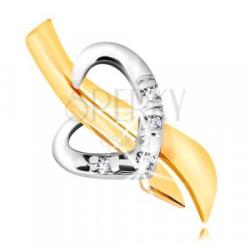 9K kombinált arany medál melyet enyhén hullámos sávok és aszimmetrikus fehér arany szív alakzat alkotja. A szív alsó részén négy kerek, átlátszó cirkónia található. A medál felülete fényes. A láncra kerülő szem a medál hátsó részén található. Medál méretei: 8 x 15 mmSúly: 0,3 gLáncra kerülő szem szélessége: 1,5 mmFémjelzéssel ellátott. Medál lánc nélk