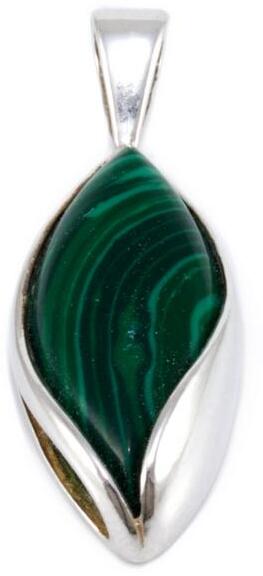 Modern stílusú, ródiummal bevont, hosszúkás malachit kővel ékített, mutatós ezüst medál.