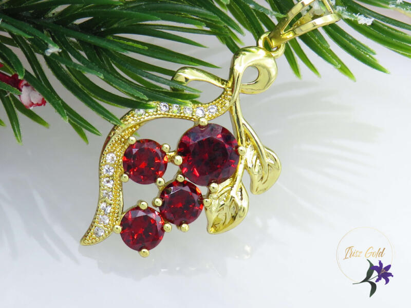 Gold Filled szőlő medál piros cirkóna kövekkel Szin: 14K Méret: 35x20mm A forgalmazott divatékszerek alapanyaga nikkel és ólommentes ezért többnyire nem okoznak allergiás tüneteket, nyugodtan hordhatják fémérzékeny emberek is. Általában nem színezik a bőrt és más divatékszerekhez képest nagyságrendekkel jobb kopásállósággal rendelkeznek. A fehér (ezüst) színű éks