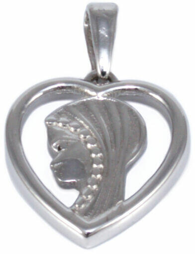 Modern stílusú, kedvelt fazonú, ródiummal bevont, áttört kialakítású, Mária szív fehérarany medál.