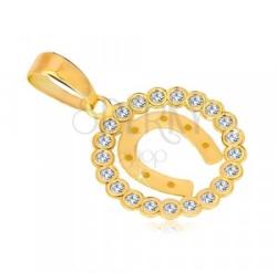 14K sárga arany díszített kör medál. A kör kerek, csiszolt, átlátszó cirkóniákkal van körbe rakva. Középen egy fényes sima patkó található. A patkó hét egymás mellett elhelyzkedő kör alakú mélyedéssel van díszítve. A láncra kerülő szem hosszúkás felfelé enyhén szélesedik. Medál mérete: 15 mmMedál súlya: 0,6 gLáncra kerülő szem szélessége: 4 mmFémjelzé
