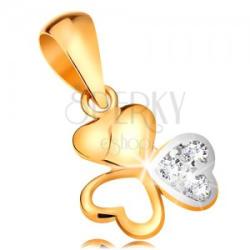 585 arany medál háromlevelű lóhere alakban, amely három összekapcsolt szívből tevődik össze - egy fényes és sima szív, egy fehér arany szív beültetett, átlátszó cirkóniákkal és egy harmadik szív körvonal alakban. A láncra kerülő szem hosszúkás alakú és felfelé enyhén szélesedő. Medál méretei: 9 x 9 mmMedál súlya: 0,26 gLáncra kerülő szem szélessége: 2 mm
