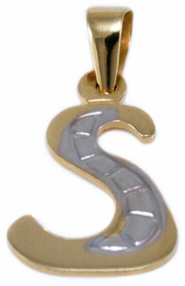 Modern stílusú, kedvelt fazonú, ródiummal és véséssel díszített, kétszínű arany "S" betű medál.