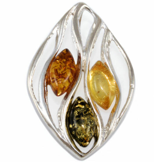 Modern stílusú, áttört kialakítású, borostyán kővel ékített, mutatós ezüst medál.