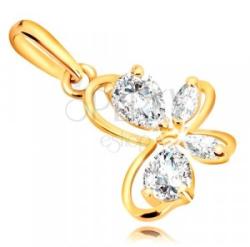 9K sárga arany medál amely lepke alakú. A felső szárnyak két nagyobb cirkóniával az alsók pedig két kisebb cirkóniával vannak díszítve. A csillogó cirkóniák átlátszóak. A láncra kerülő szem hosszúkás. Medál méretei: 11 x 9 mmMedál súlya: 0,3 gLáncra kerülő szem szélessége: 1 mmFémjelzéssel ellátott. Medál lánc nélkül.