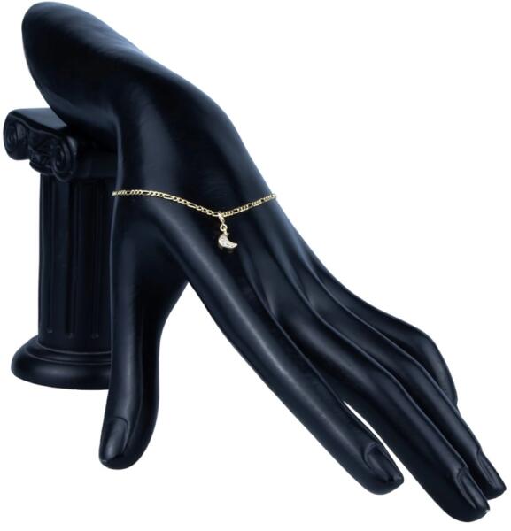A 585 sárga aranyból készült levehető medál félhold alakú, sima szegéllyel és strukturált felülettel. Apró pöttyök díszítik, amelyek közé kerek, átlátszó cirkóniák vannak beillesztve. A medál egy rugós gyűrű segítségével karkötőre vagy láncra rögzíthető. A medál méretei: 5 x 5,5 mmA medál súlya: 0,25 gRugógyűrű átmérője: 2,5 mmFémjelzés - van. A lá