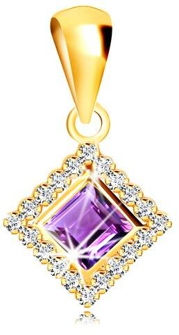9K sárga arany medál, négyzet alakú. A medál közepén sötét lila csiszolt cirkónia helyezkedik el a szélén pedig apró kerek, átlátszó cirkóniák találhatóak. A láncra kerülő szem hosszúkás, felfelé enyhén szélesedik. Medál méretei: 9 x 11 mmSúly: 0,3 gLáncra kerülő szem szélessége: 2,5 mmFémjelzéssel ellátott. Medál lánc nélkül.