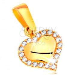 A sárga 585 arany medál kis, szimmetrikus szív alakú, amelyet csillogó, átlátszó, kerek alakú cirkóniák vonala szegélyez. A szív közepe fényes és sima. A láncra kerülő szem hosszúkás alakú és felfelé haladva enyhén szélesedik. Medál méretei: 9 x 9 mmMedál súlya: 0,5 gLáncra kerülő szem szélessége: 2 mmFémjelzéssel ellátott. Medál lánc nélkül.