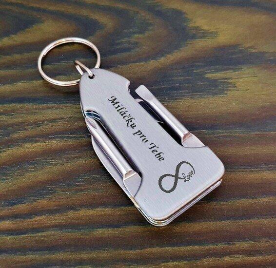 Praktikus fém függő késsel, konzervnyitóval, PH csavarhúzóval és lapos pengésű csavarhúzóval. Összehajtott medál mérete 6 cm.