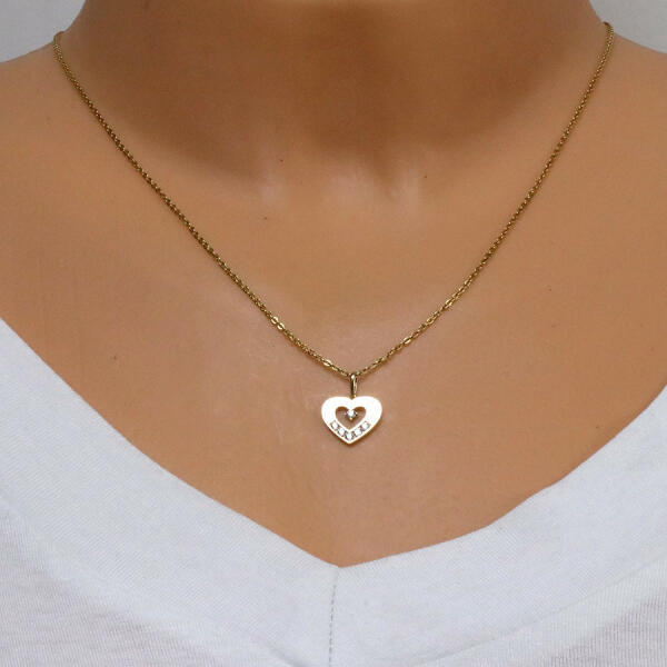 Az 375 sárga arany medál lapos szív alakú, amelybe kerek átlátszó cirkóniák vannak ágyazva. A szív közepén egy kivágás és egy nagyobb, átlátszó, pálcák közé helyezett cirkónia található. A medál felülete fényes és sima. A láncra kerülő szem felfelé szélesedik. A medál mérete: 12 x 12 mmA láncra kerülő szem szélessége: 2 mmA medál súlya: 0,67 gFémjelzés