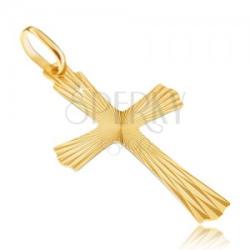 Arany medál, lapos kereszt fényes sugaras felszínnel. A kereszt szárai a végei felé szélesednek és lekerekített véggel fejeződik be. Méretek: 16 x 26 mmA medál súlya: 0,7 gA láncon lévő szem szélessége: 3 mmMedál lánc nélkül. Fémjelzéssel ellátott.