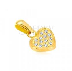 14K sárga arany medál, szimmetrikus szív alakban. A medál felületét apró, átlátszó cirkóniák borítják. Láncra kerülő szem szélessége felfelé enyhén szélesedik. Medál mérete: 8 x 7 mmMedál súlya: 0,25 gLáncra kerülő szem szélessége: 2 mmFémjelzéssel ellátott. Medál lánc nélkül.