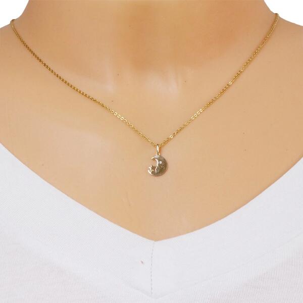 Az 585 sárga aranyból készült medál hold alakú, melynek szemeit átlátszó cirkónia díszíti. A Hold alsó részéhez egy ötágú csillag kapcsolódik. A medál fényes és sima felületű. A láncra kerülő láncszem hosszúkás és felfelé kiszélesedik. Medál mérete: 8 x 12 mmA láncra kerülő láncszem szélessége: 1,5 mmA medál súlya: 0,39 gFémjel - Van. A lánc nem tartoz