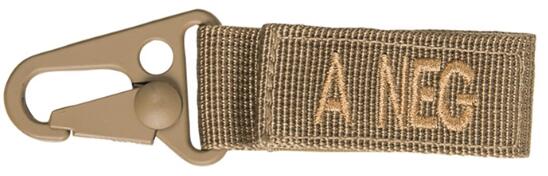 Karabiner vércsoport jelzéssel. Felakasztásra szolgál, életmentő információt nyújt. Szalag: 100% poliészter, Karabiner: cinkötvözet. Méretek: 11x3,7cm, Súly: 22g. Felhasználás: kulcsokra, pénztárcára, övre, stb. Előnyök: merev kivitelezés.