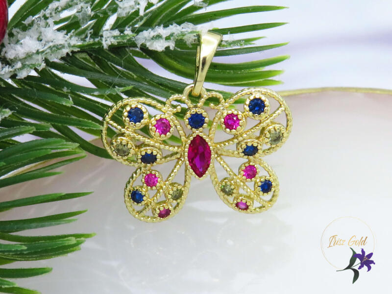 Gold Filled gyönyörű színes köves pillangó Szin: 14K Méret: 20x20mm A forgalmazott divatékszerek alapanyaga nikkel és ólommentes ezért többnyire nem okoznak allergiás tüneteket, nyugodtan hordhatják fémérzékeny emberek is. Általában nem színezik a bőrt és más divatékszerekhez képest nagyságrendekkel jobb kopásállósággal rendelkeznek. A fehér (ezüst) színű ékszer