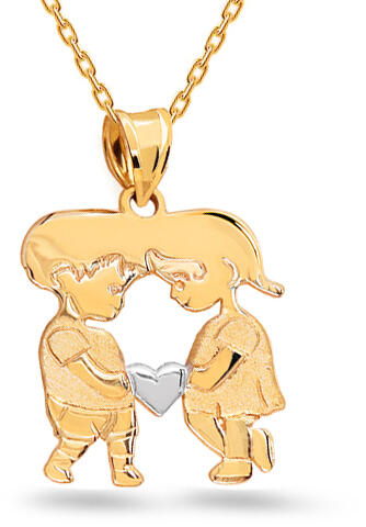 Az aranyos medál két karakterből áll - egy fiúból és egy lányból, akik gyengéden egy gyönyörű szívet tartanak a kezükkel. A medál sárga aranyból készült, magasfényű felülettel, amely kiemeli az aranyat. Egy gyönyörű medál, amely kifejezi például a testvérek kölcsönös szeretetét.