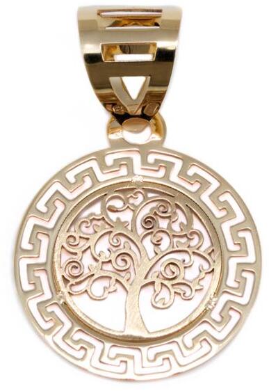 Modern stílusú, kedvelt fazonú, véséssel díszített, görög mintás, áttört kialakítású kör arany medál.