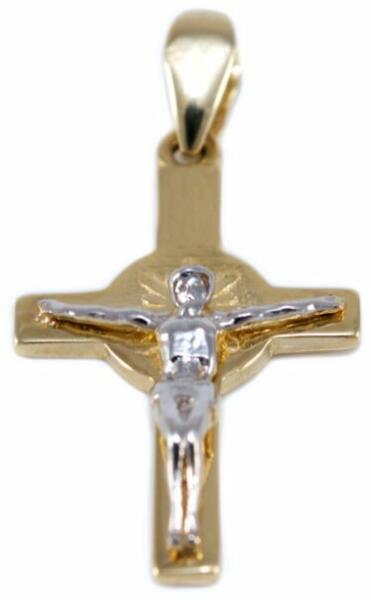 Masszív kialakítású, pici fényes arany kereszt medál ródiummal díszített arany feszülettel kombinálva.