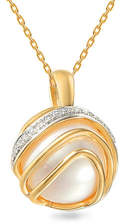 A 8 mm átmérőjű fehér édesvízi Biwa gyöngyöt finom aranyvonalak ölelik körül, míg a központi részen összesen 15 briliáns csiszolású gyémánt található, amelyek összsúlya 0,040 ct, színük H, tisztaságuk SI1. Ez az ékszer olyan nők számára alkalmas, akik egy visszafogott, mégis feltűnő kiegészítőt keresnek egy esküvőre vagy más különleges alkalomra.