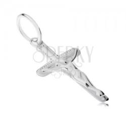925 ezüst medál lapos latin kereszt alakban, amelyen Krisztus teste található precízen kidolgozott részletekkel. A kereszt szárai apró pontokkal díszítettek. A láncra kerülő szem kerek. A medál méretei: 10 x 19 mmA medál súlya: 0,54 gA láncra kerülő szem szélessége: 4 mmFémjelzéssel ellátott. Medál lánc nélkül.