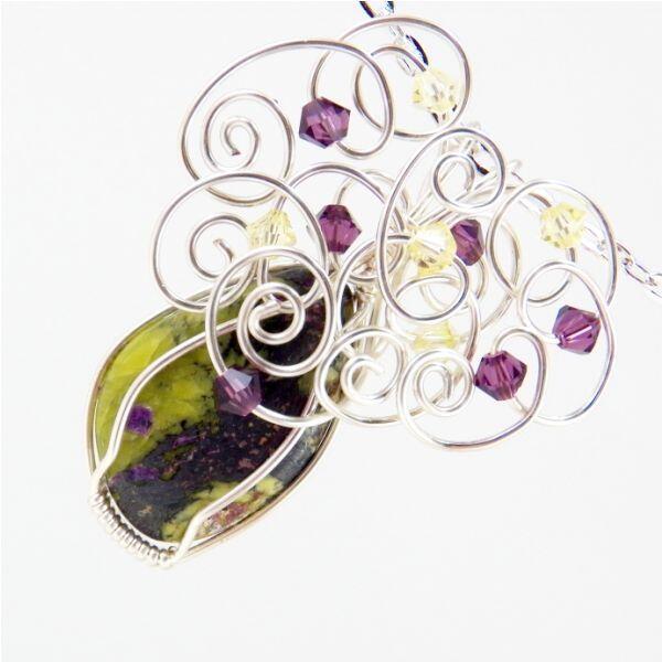 Ezüst drótba foglaltam ezt a különleges Atlantiszit drágakövet és hozzá illő Swarovski kristály gyöngyökkel díszítettem. Az atlantiszit a szerpentin és a lilás rózsaszínű stictit ásványokból álló kristály. Mivel színe főként zöld és lilás rózsaszín, így a szívre és szívcsakrára van jótékony hatása. A fotó az ékszerről készült, színe monitoronként elt