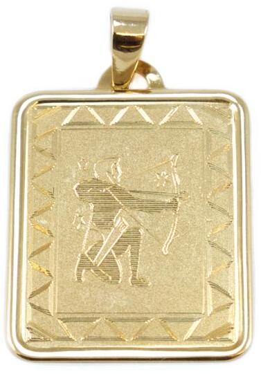 Kedvelt fazonú, véséssel és mattítással díszített, nyilas horoszkóp, sárga arany lap medál.