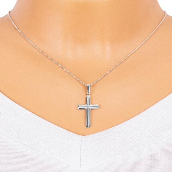 A kereszt alakú medál 925 ezüstből készült. A fényes felületet párhuzamos keskeny bevágások díszítik. A vésetek középen nem metszik egymást, keskeny kereszt alakot alkotnak. Méret: 16 x 29 mmA láncra kerülő szem szélessége: 4 mmA medál lánc nélkül kapható. A medál súlya: 1,90 gFémjelzéssel ellátott.
