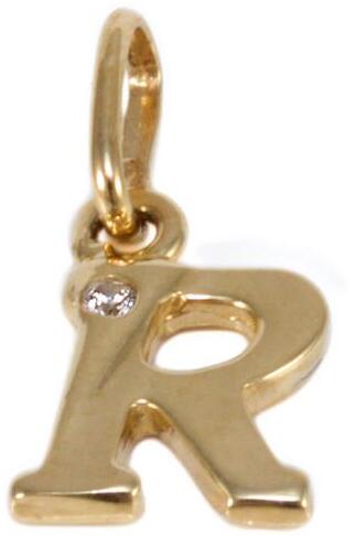 Klasszikus és kedvelt fazonú, cirkónia kővel ékített, kicsi arany "R" betű medál.