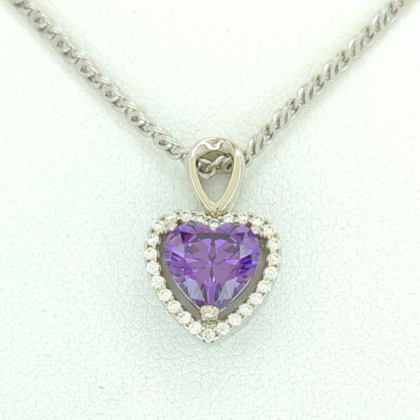 Ezüstszínű, csillogó lila és fehér cirkónia kristállyal díszített szív medál. A kristályok karmos foglalatban helyezkednek el. Időtálló ékszer, víz hatására nem feketedik. Antiallergén ékszer. Medál mérete: 12 mm x 11 mm. A nyakláncok különböző méretben kérhetők, ezek mintája esetleg eltérhet a képen láthatótól, szélessége 2 mm vagy 3 mm. Az antiallergén é