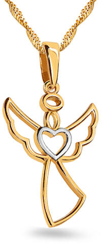 - Arany medál angyal ruhában, közepén kombinált arany szívvel. - A medál közepe kitöltetlen, egy angyal körvonalait képezi. - Alkalmas mindennapi viseltre és különleges alkalmakkor is.