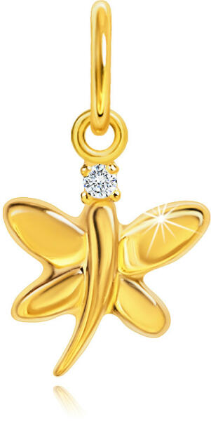 Fényes medál 9K sárga aranyból pillangó alakban, mely testét enyhe hajlított vonal alkotja. A lepke feje foglalatba beültetett átlátszó cirkóniából áll. A medál felszíne domború és sima. A láncra kerülő szem ovális. A medál méretei: 9 x 11 mm A láncra kerülő szem szélessége: 2 mm A medál súlya: 0,2 g Fémjelzéssel ellátott. Medál lánc nélkül.