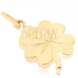 375 arany fülbevaló lapos szerencsét hozó lóhere alakban, amelynek fényes, sima felülete van. Középen bemetszések díszítik a levél strukúráját ábrázolva. A medál kétoldalas. A láncra kerülő szem pedig ovális alakú. A medál méretei: 10 x 11 mmA medál súlya: 0,4 gA láncra kerülő szem szélessége: 2 mmFémjelzéssel ellátott. Medál lánc nélkül.