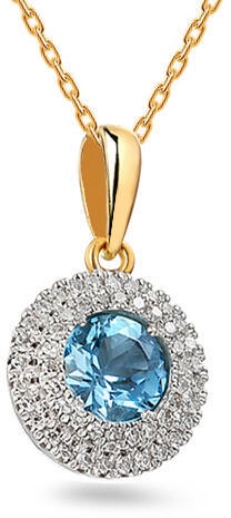 Kombinált aranyból készült medál, ötven csillogó gyémánttal díszítve, össztömege 0,110 ct, H szín és SI1 átlátszóság. Ezeket egy gyönyörű égszínkék, 0,550 ct súlyú topáz veszi körül. A medál szélessége 9 mm, a láncon lévő fűzőlyuk átmérője 2 mm, a medál magassága a füllel együtt 16 mm. A kövek iZlato® eredetiségi tanúsítvánnyal rendelkeznek.