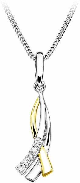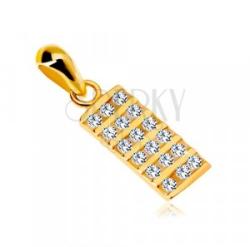A 14K sárga arany medált egy téglalap forma alkotja, amelyet átlátszó cirkóniás sávok díszítenek. A három cirkóniából álló sávokat vízszintes, keskeny arany vonalak választják el egymástól. A láncra kerülő szem hosszúkás, felfelé enyhén szélesedik. Medál méretei: 5 x 10 mmMedál súlya: 0,4 gLáncra kerülő szem szélessége: 2 mmFémjelzéssel ellátott. Medál l