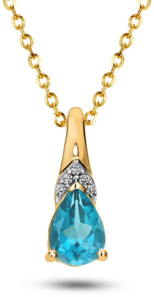 Hangsúlyozza ki eleganciáját ezzel a finom topáz medállal. Az ékszer 14 karátos sárga aranyból készült, mely modern megjelenést kölcsönöz neki. A medál domináns vonása egy bájos világoskék színű natúr topáz (0,77 ct), amely fölött finoman kiemelődik egy 0,030 ct össztömegű briliáns dísz formájú dekoráció (H szín, SI1 tisztaság). A medál mindennapi viseletre
