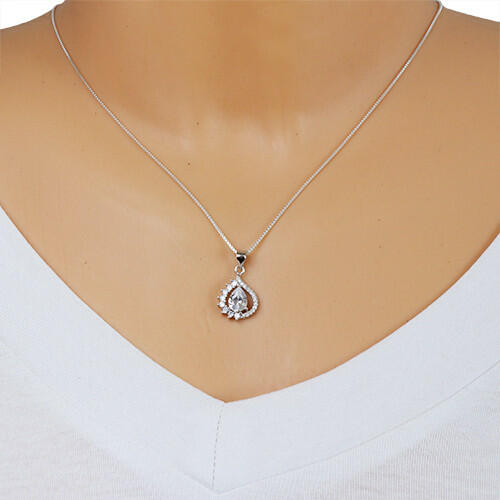 Medál 925 ezüstből átlátszó cirkóniás körvonal könnycsepp alakban, amelybe egy csiszolt, átlátszó cirkónia van ültetve ugyanolyan alakban. Az egyik oldalon a cirkóniák keretbe vannak ültetve a másikon pedig foglalatokba karmokkal megfogva, amely egy fogazott vonalat képez. A medál felülete ródiummal kezelt. A medál méretei: 13 x 19 mmA medál súlya: 2,1 gA láncra kerül