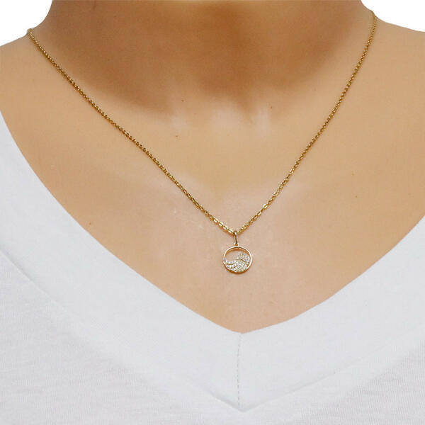 A 9K sárga arany medál egy angyalszárny és egy vékony kör, amelyre a szárnyat helyezték. A szárny pazarul díszített apró cirkóniákkal az egész felületén. A kör felülete sima és fényes. A láncra kerülő szem hosszúkás és felfelé szélesedik. A medál átmérője: 10 mm A láncra kerülő szem szélessége: 1,5 mm. A medál súlya: 0,37 g Fémjel - Van. A lánc nem tartoz