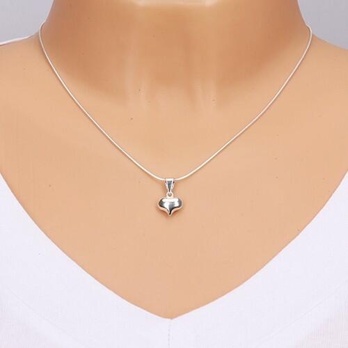 925 ezüst medál kis szimmetrikus szív alakban, sima és fényes felülettel. A szív csücske hegyes és a felső ívek enyhén lapítottak. Az egész medál formája domború. A láncra kerülő szem felfelé szélesedik. A medál méretei: 8 x 10 mmA láncra kerülő szem szélessége: 4 mmA medál súlya: 0,6 gFémjelzéssel ellátott. Az ár egy medálra vonatkozik, lánc nélkül.