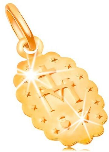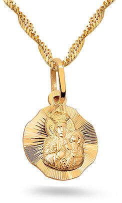 A sárga 18K arany medál kétoldalú, ovális alakú. Az egyik oldalát Szűz Mária díszíti, hosszú ruhában és fénykoszorúval, a medál kerületén pedig szöveg található. A másik oldalát egy M betű motívuma díszíti, kereszttel és szívekkel. A láncra kerülő szem ovális. Medál méretei: 9 x 15 mmMedál súlya: 0,5 gLáncra kerülő szem szélessége: 2,5 mmFémjelzéssel el