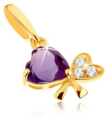 Medál 9K sárga aranyból masni alakban, melynek egy része három átlátszó cirkóniával van kirakva, a másik lila színű szív alakra csiszolt ametiszttel díszített. A függő szalag fényes és sima. A láncra kerülő szem hosszúkás. A medál méretei: 10 x 7 mm A medál súlya: 0,34 gA láncra kerülő szem szélessége: 1,5 mmFémjelzéssel ellátott. Medál lánc nélkül.