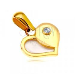 A 14K sárga arany medál szabályos szív alakú, amely két részre van osztva. Az egyik fele arany szélű, enyhén szivárványos visszfényű, természetes gyöngyházzal kitöltve. A szív másik fele fényes és sima, átlátszó cirkóniával díszítve. A láncra kerülő szem hosszúkás, felfelé enyhén szélesedik. Medál méretei: 10 x 8 mmMedál súlya: 0,4 gLáncra kerülő szem sz