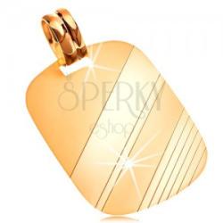 A sárga 14K arany medált egy lapos, téglalap alakú tábla alkotja, enyhén lekerekített sarkakkal. A táblán vékony, vésett sávok haladnak átlósan, amelyek a medált különböző szélességű, fényes és matt vonalakra osztják. A láncra kerülő szem megkettőzött. Medál méretei: 20 x 27 mmMedál súlya: 2,1 gLáncra kerülő szem szélessége: 5 mmFémjelzéssel ellátott. Med